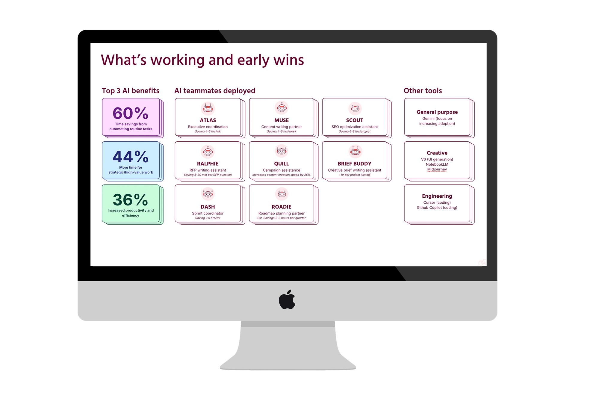 Recognized that scattered AI experimentation was creating confusion and minimal productivity gains. Only 19% of marketing achieved consistent AI usage while 40% lost 6+ hours weekly to administrative work. As executive sponsor, built the governance infrastructure and adoption systems that transformed Marketing into Asana's first AI-native organization.