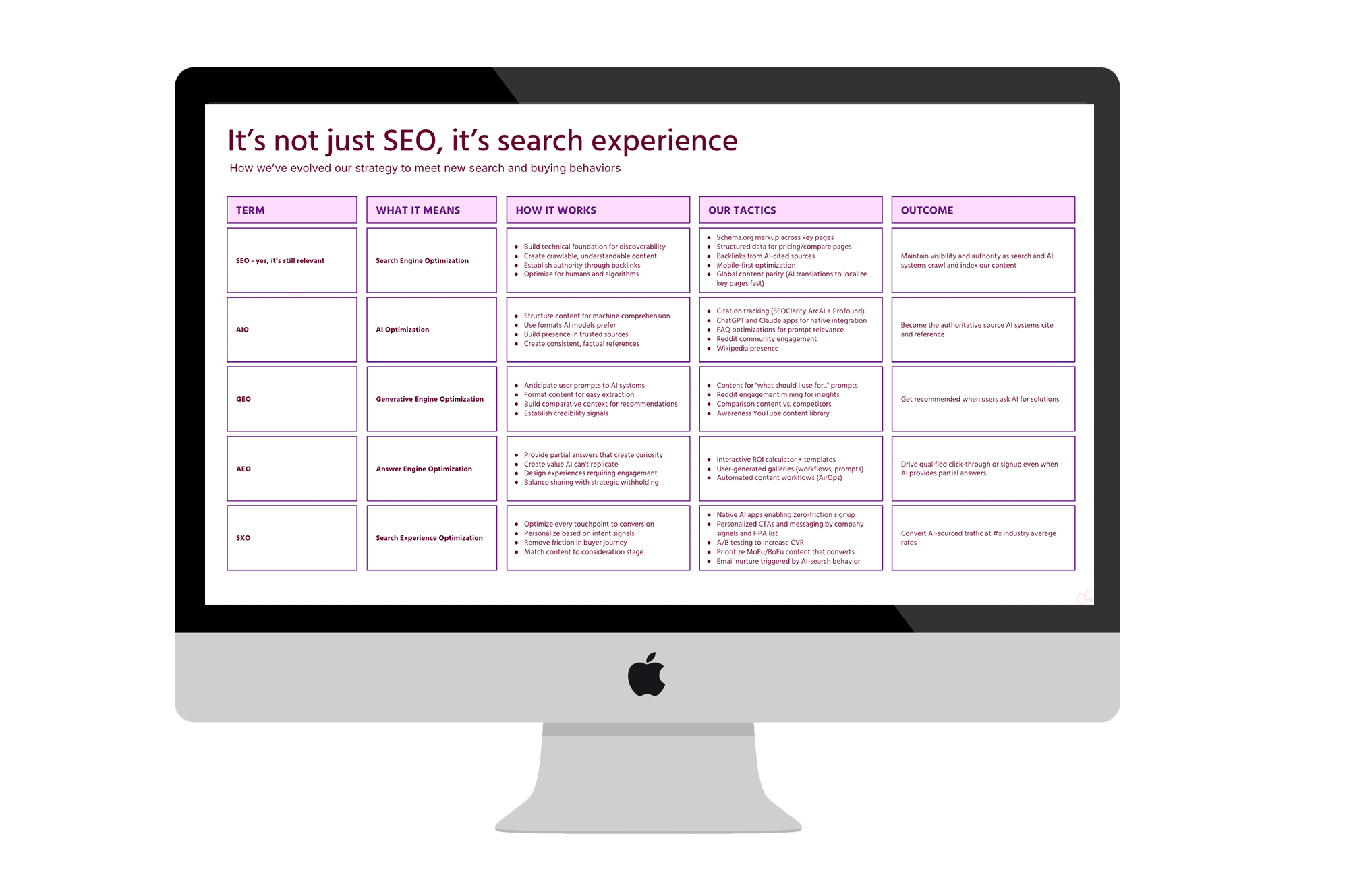 Led cross-functional initiative spanning marketing, product, and engineering to establish authority in AI recommendation engines including ChatGPT, Perplexity, and Google AI Overviews. Partnered across functions to implement structured data, accelerate content velocity, and launch native AI applications enabling zero-friction acquisition.